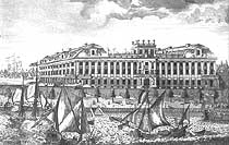 потому, что находился напротив дворца А. Д. Меншикова, в первом этаже которого размещались